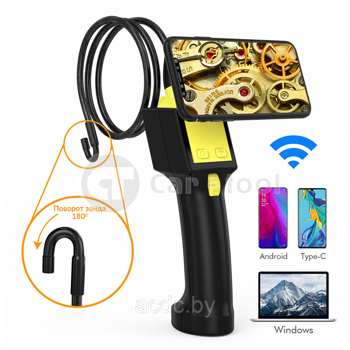 iCartool IC-V8051W управляемый видеоэндоскоп с поворотной камерой на 180°. Эндоскоп оснащен полужестким зондом диаметром 8,5 мм и длиною 0,8 метра. Для крепления телефона используется магнитная площадка. Широкий угол обзора 70° обеспечивает прекрасный обзор. В комплект входит многофункциональный USB кабель, при помощи которого можно подключить эндоскоп к различным устройствам с ОС Android/Windows/Mac.