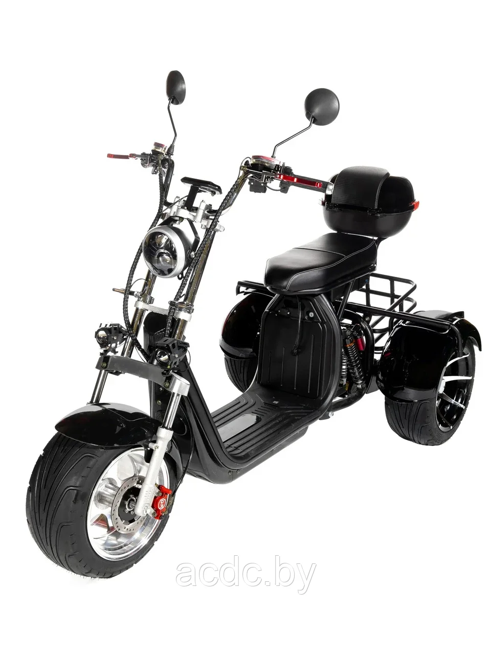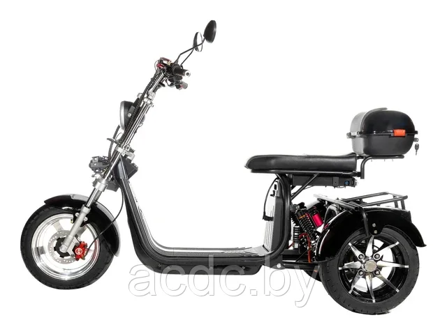 Электроскутер трехколесный СityCoCo Trike PRO – прекрасное решение для тех, кто ищет в движении устойчивость и безопасность. Это проходимый электроскутер на 3-х колесах, способный вывезти вас из любой грязи и бездорожья. У него внедорожный рисунок протекторов, есть возможность заднего хода, широкие колеса – диски алюминиевые, диаметром 12 дюймов, при общем диаметре колеса с покрышками в 18 дюймов (45 см).